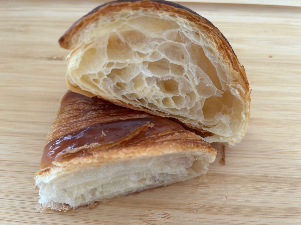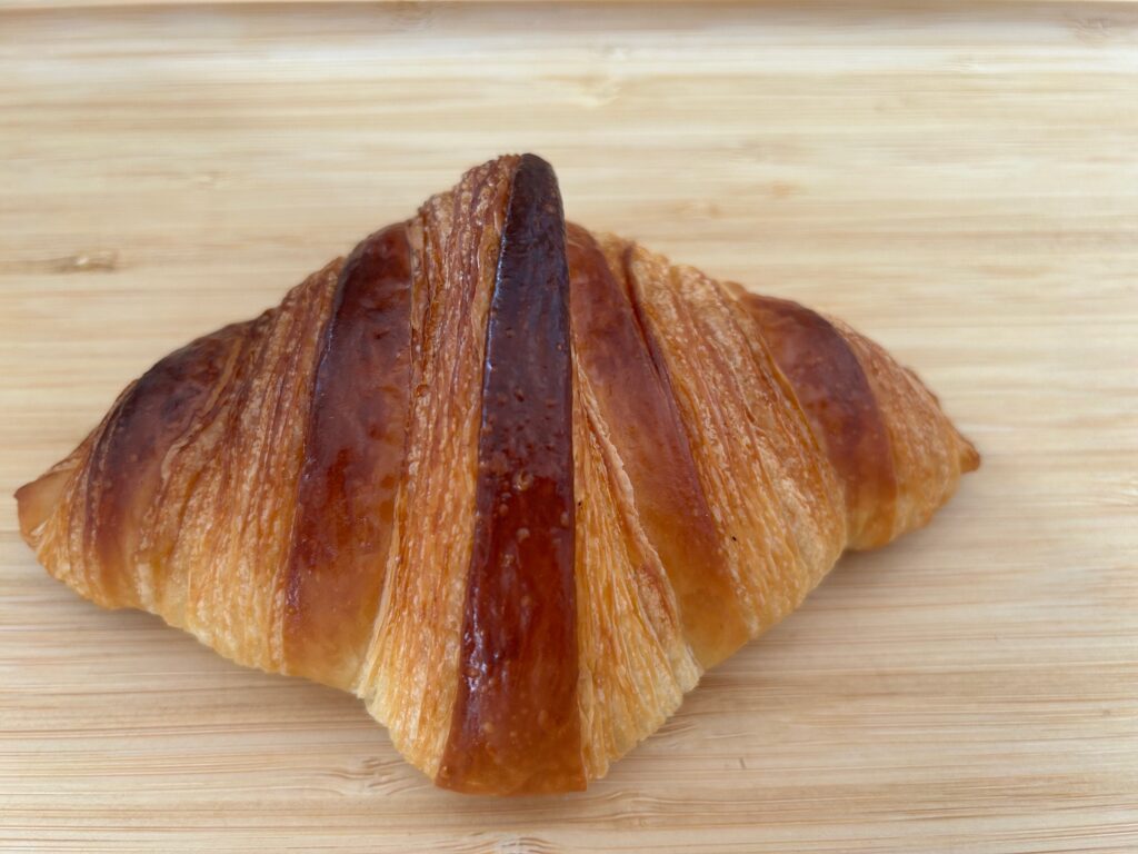 古今果ではケーキや焼き菓子だけでなく、パンも販売されています。写真のクロワッサンはバターの香りが高く外はパリパリ中はパターがよく効いてふわふわです。