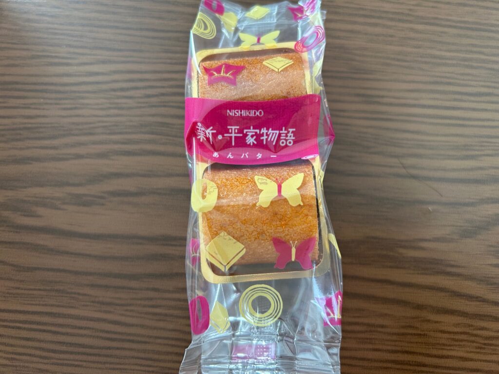 新・平家物語は通常は赤あんと白あんのペアで箱に入ってるのですが、あんバターは新商品で北海道産小豆のコク深い甘みと、まろやかなバターを合わせた特製あんバタークリームを、しっとり食感のバームクーヘンでやさしくサンドした一品です。豊かな風味が広がるあんバターに、瀬戸内産の藻塩がアクセントとして加わり、甘さの中にほどよい塩味が重なります。和の素材と洋菓子の技法が調和した、上品で満足感のある和洋折衷スイーツです。