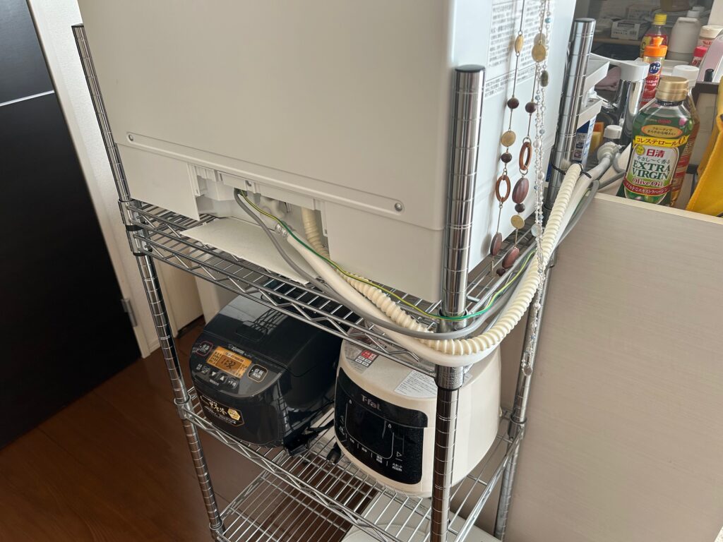 前の食洗機の時は違う賃貸でしたが近くにドン・キホーテがありスチールラックの上が板になっていてとても使いやすかったんですが、今回行ったホームセンターには無かったのでこんな形になってます。作業台やワゴンを使うくらいならスチールラックはいいと思います。