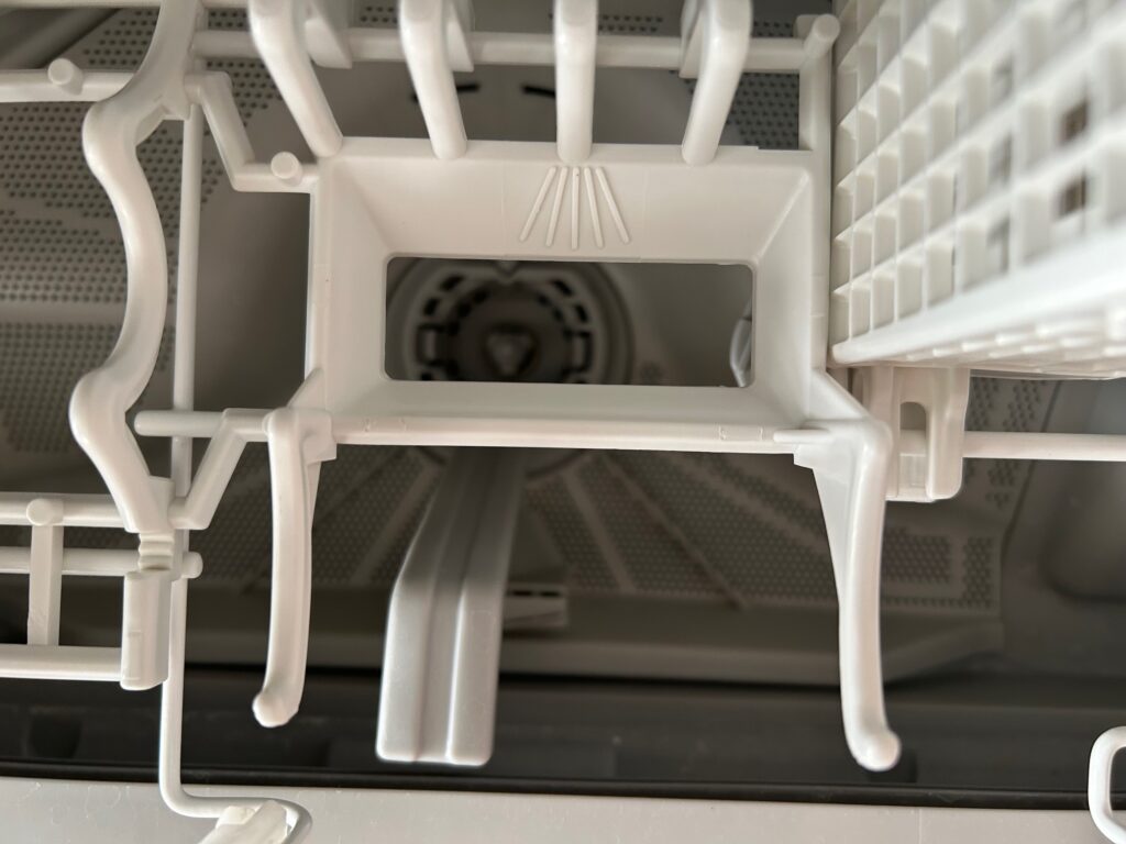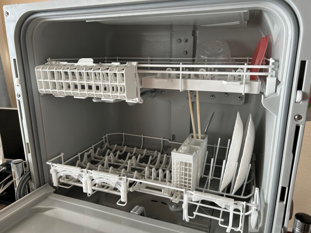 とありますが、我が家では夫婦2人なので一日分の食器を夕食後に洗いますので、画像のように朝食後・昼食後と食器が庫内に増えていくことになり、その間開けっ放しにしていますが、前の食洗機も今の食洗機もドアに引っかかることはないです。ヒンジ破損したこともないです。